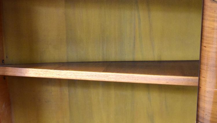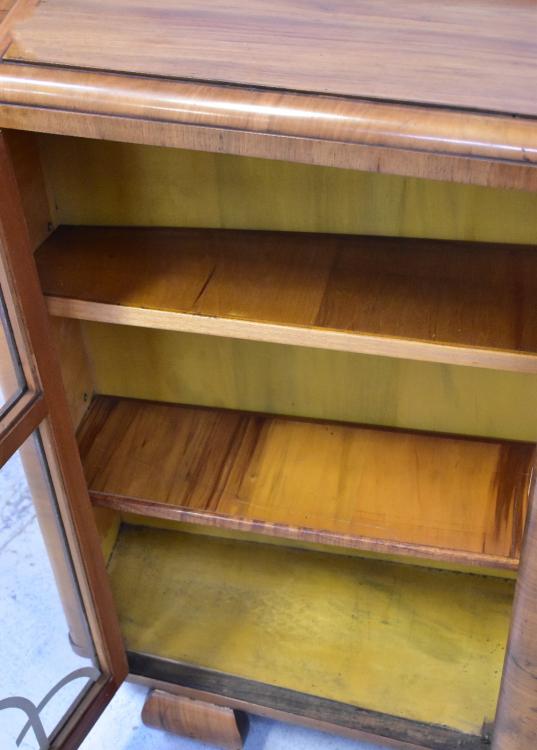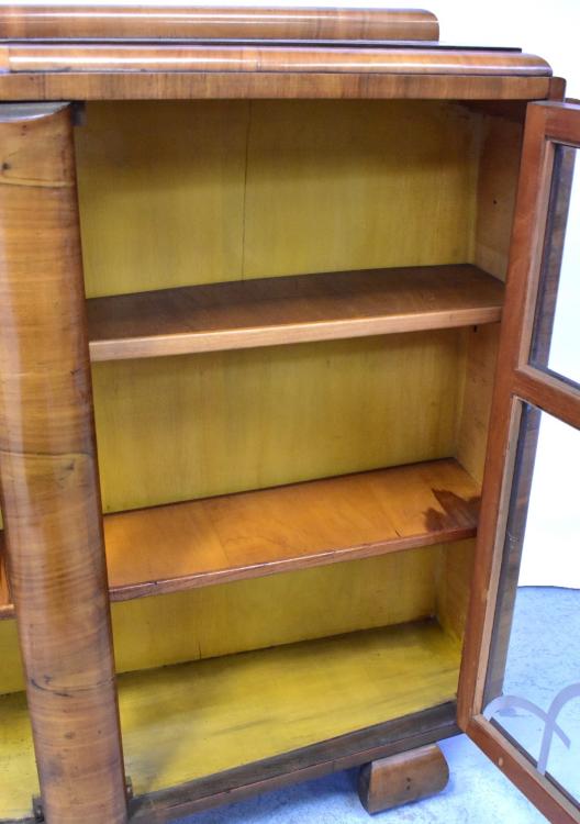 Lot 17 of 1032: An Art Deco style walnut display cabinet with architectural moulded top, the angled front centred with slim bowed panel flanked a pair of doors, each with applied Art Deco motif to the lower section and raised on shaped feet, 98 x 116 x 28cm.