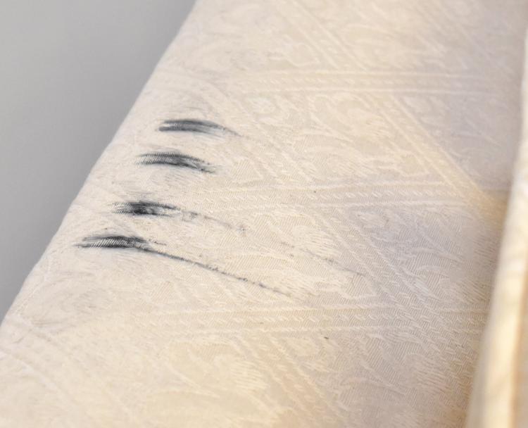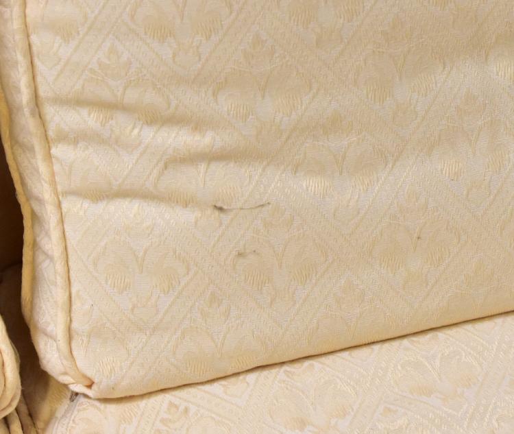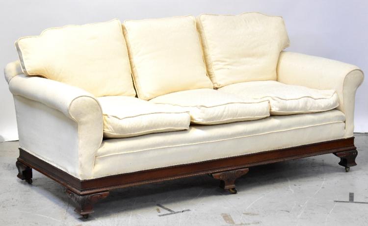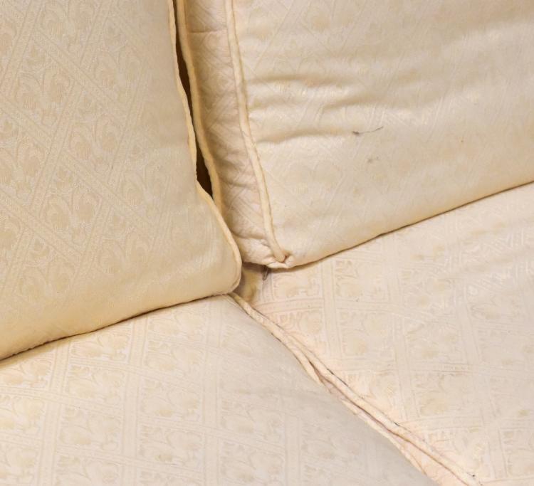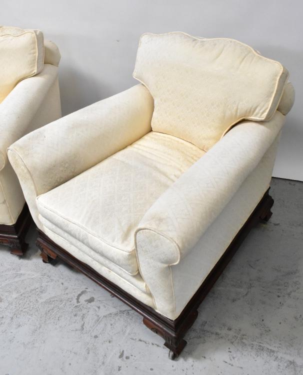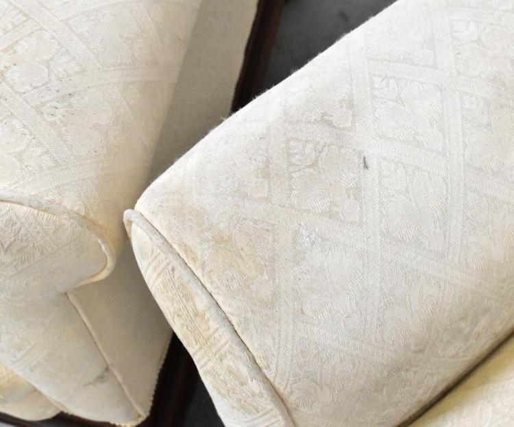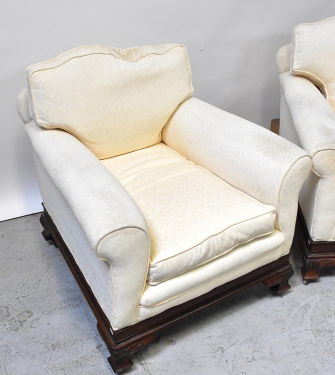 Lot 24 of 1032: An Edwardian walnut framed three-piece suite comprising a three-seater settee and pair of armchairs, all upholstered in cream fabric (3).