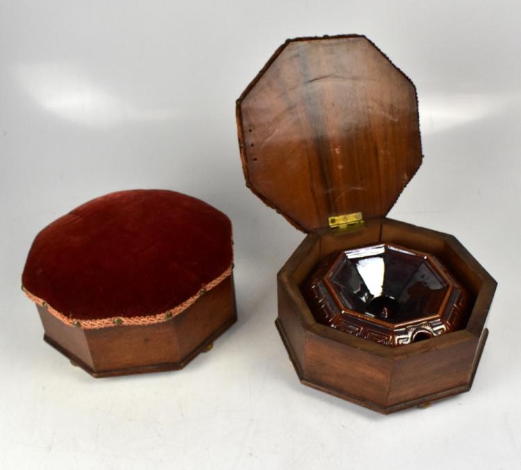 Lot 27 of 1032: Two early 20th century mahogany octagonal wooden footstools with red velvet upholstered tops, raised on four brass ball feet, both containing ceramic spittoons, diameter 21cm, 14 x 25.5 cm (2).