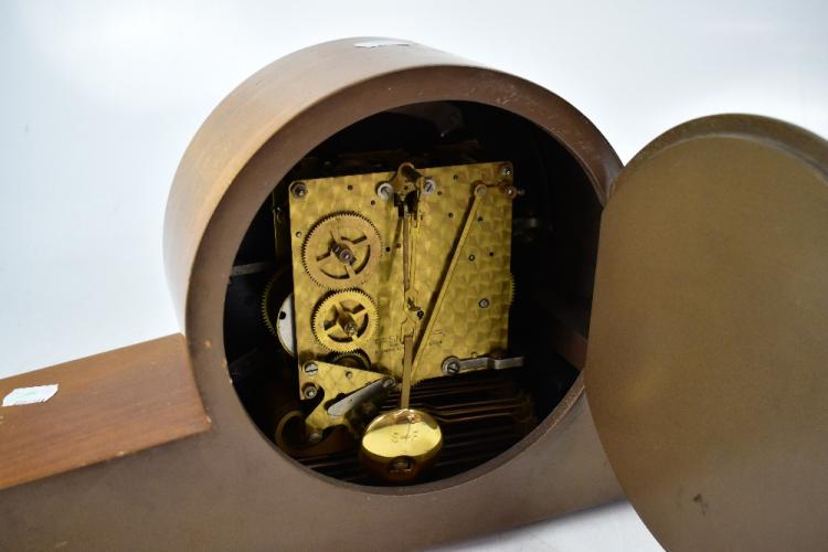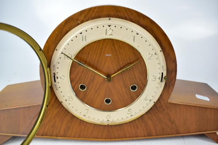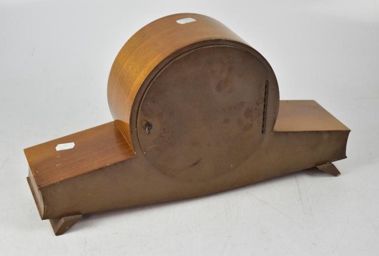 Lot 43 of 1032: A Smiths pale oak Art Deco style duel chime mantel clock with outswept supports, the wooden and cream dial set with Arabic numerals, 24 x 49cm.