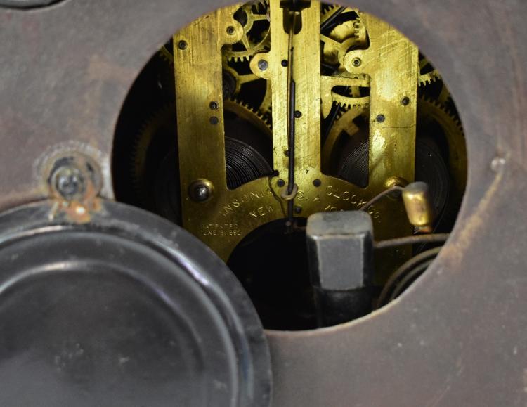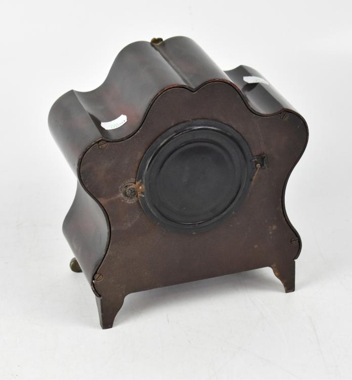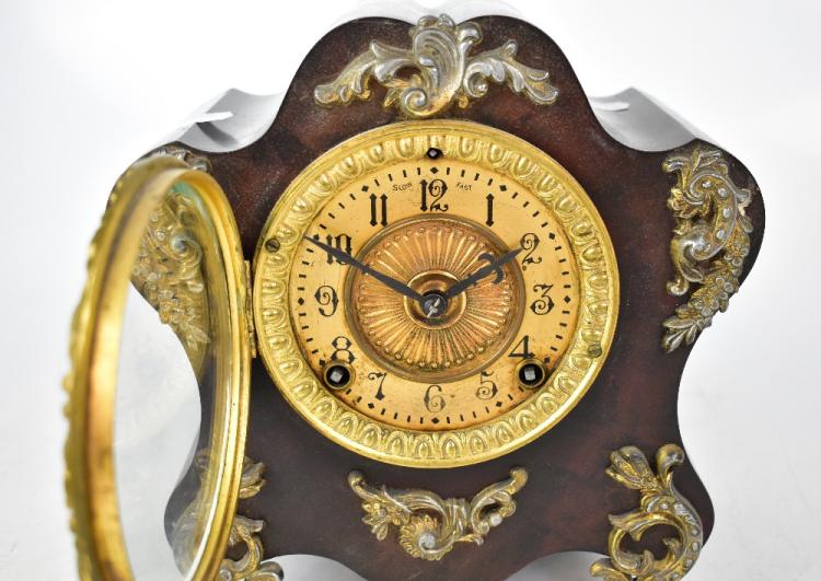 Lot 44 of 1032: ANSONIA: an early 20th century metal cased and faux wood design eight day mantel clock in the Rococo style, the painted and gilded dial set with Arabic numerals, height 25cm.