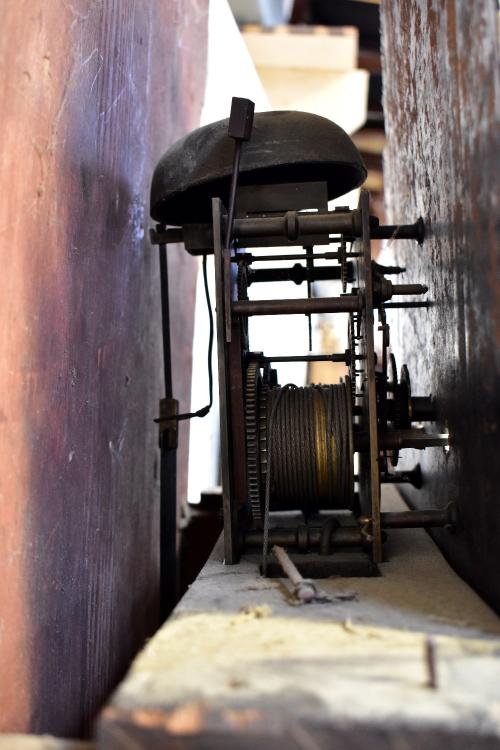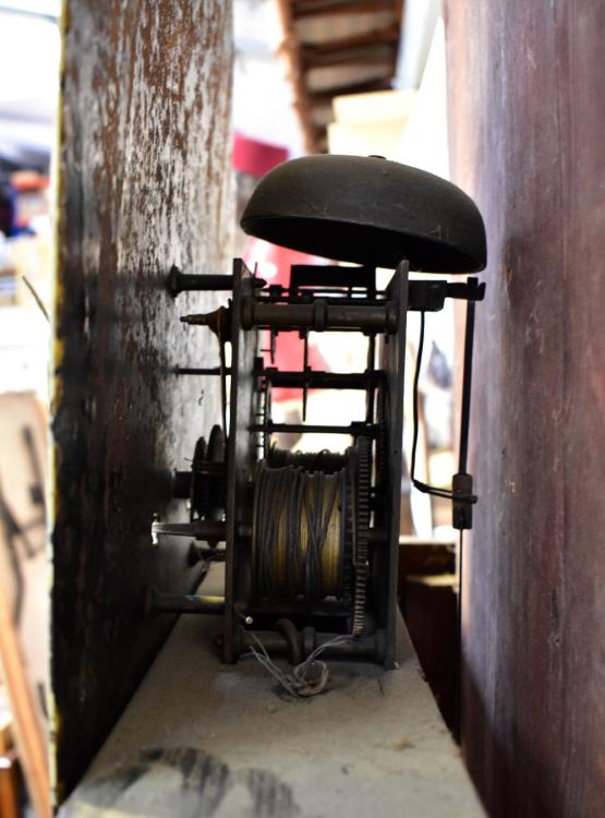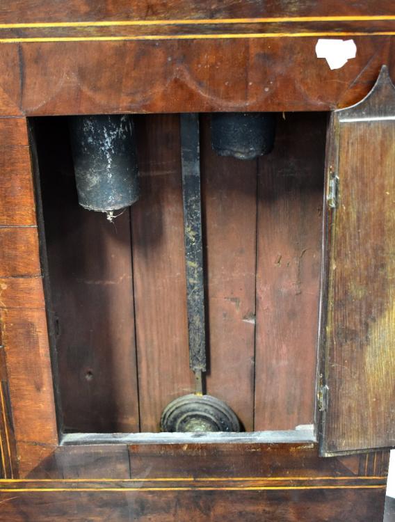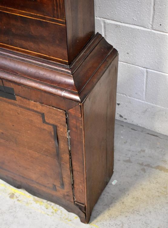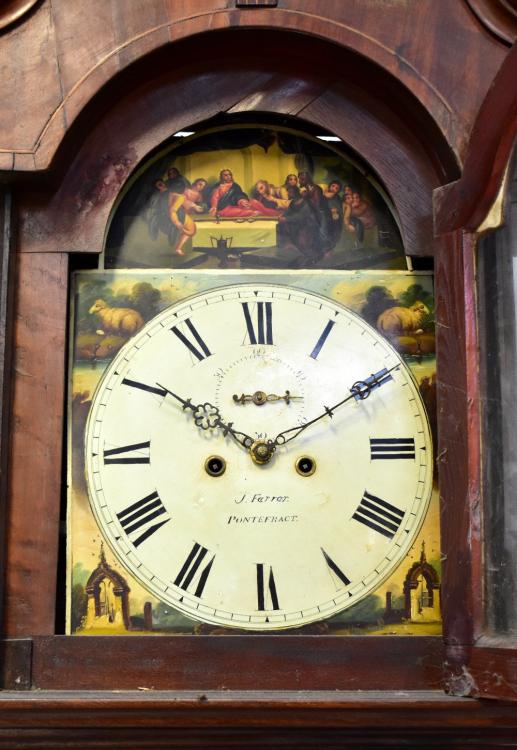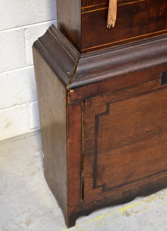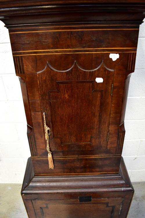 Lot 50 of 1032: An early/mid-19th century oak, mahogany crossbanded and inlaid eight day longcase clock, the arched painted dial inscribed 'J Ferrer, Pontefract', with short arched door to plinth base, height approx 235cm.