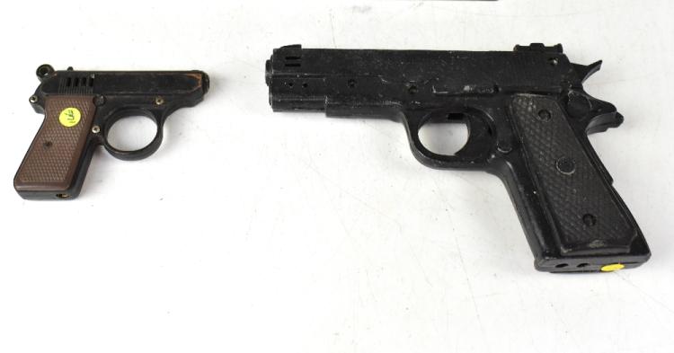 Lot 61 of 1032: Three lighters in the form of pistols, one flintlock example mounted on a stand, a Japanese made 'Colt Combat Commander' lighter, a small lighter in the form of a Colt 45 and a brass bullet lighter, height 14cm (4).