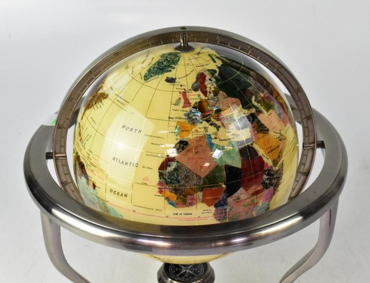 Lot 77 of 1032: A small hardstone globe raised on a white base metal gimbal, united by a stretcher with a compass, 33 x 32cm.