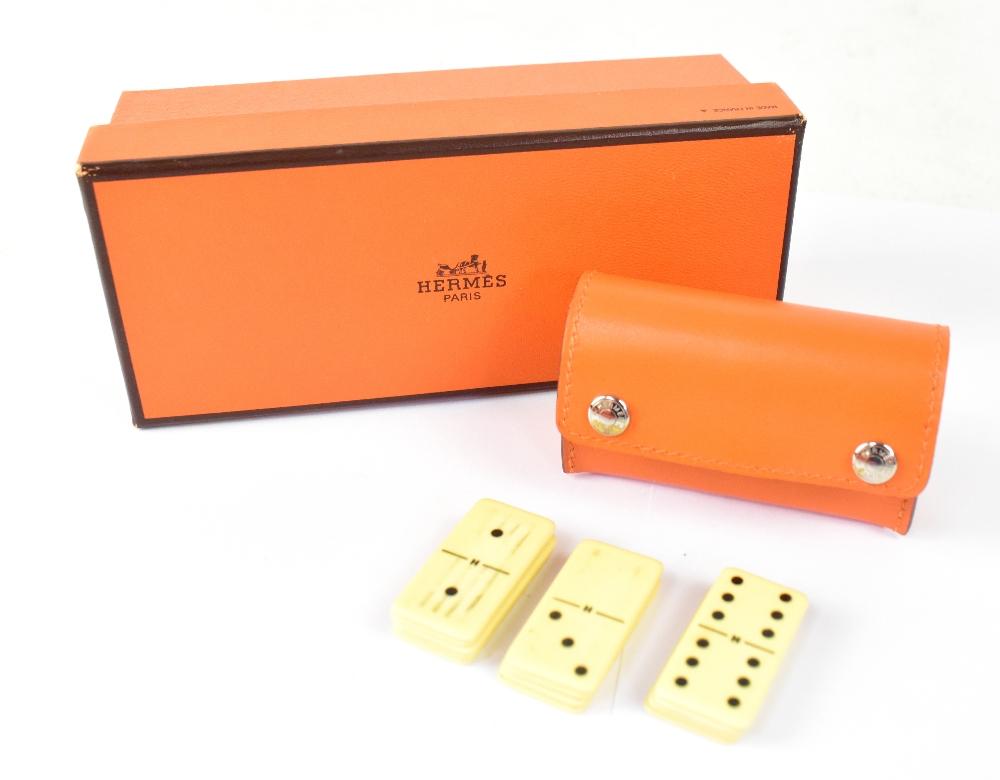 Lot 86 of 1032: HERMÈS; a small leather case containing a set of miniature dominoes cased in the iconic Hermes orange, with original Hermes box.