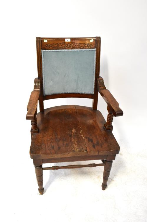 Lot 9 of 1102: An early 20th century oak open arm elbow chair with saddle seat, upholstered back panel and carved detail to the top rail, raised on turned stretchered front supports.