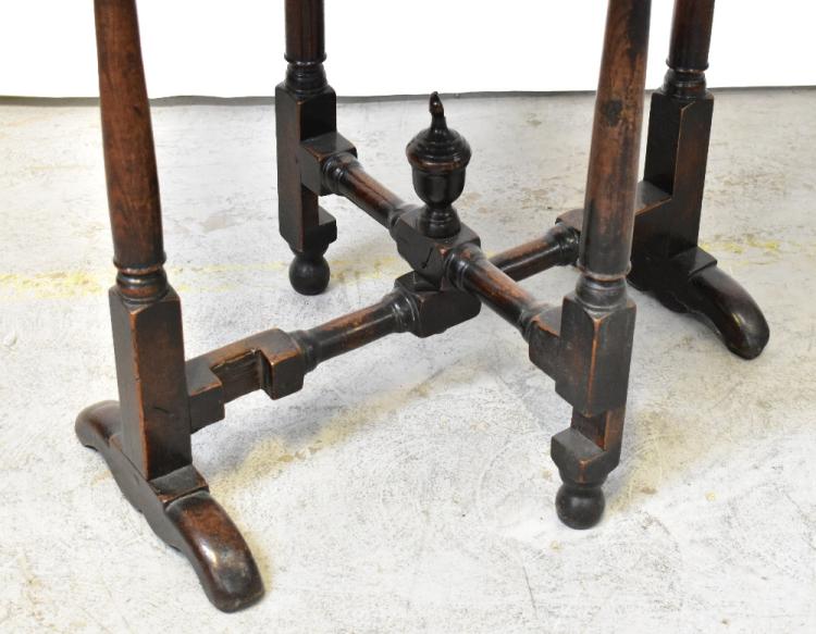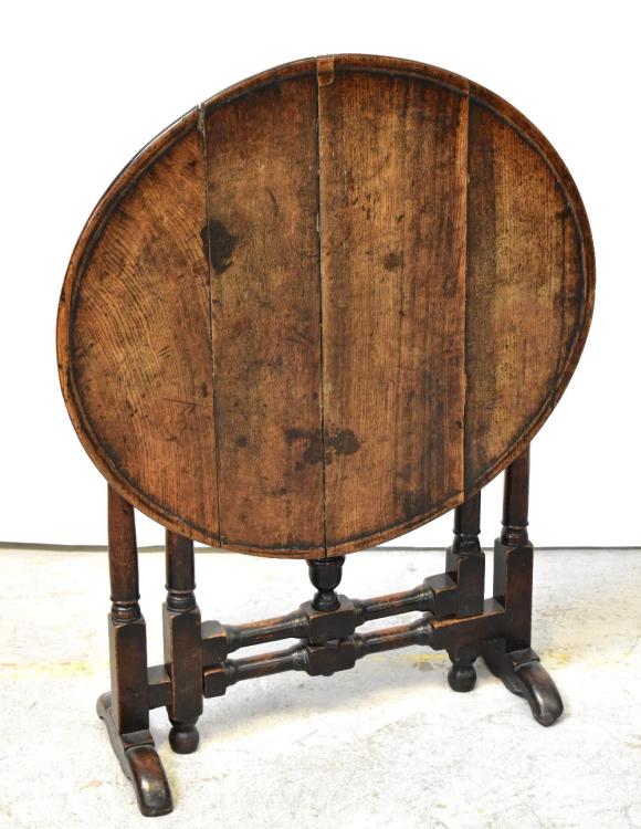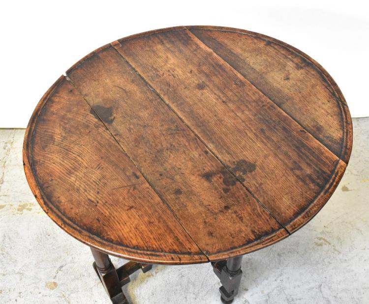 Lot 25 of 1102: A Georgian-style oak circular folding table with dished top above folding gateleg turned and block cross-stretchered support, 69 x 75x 70cm (af).