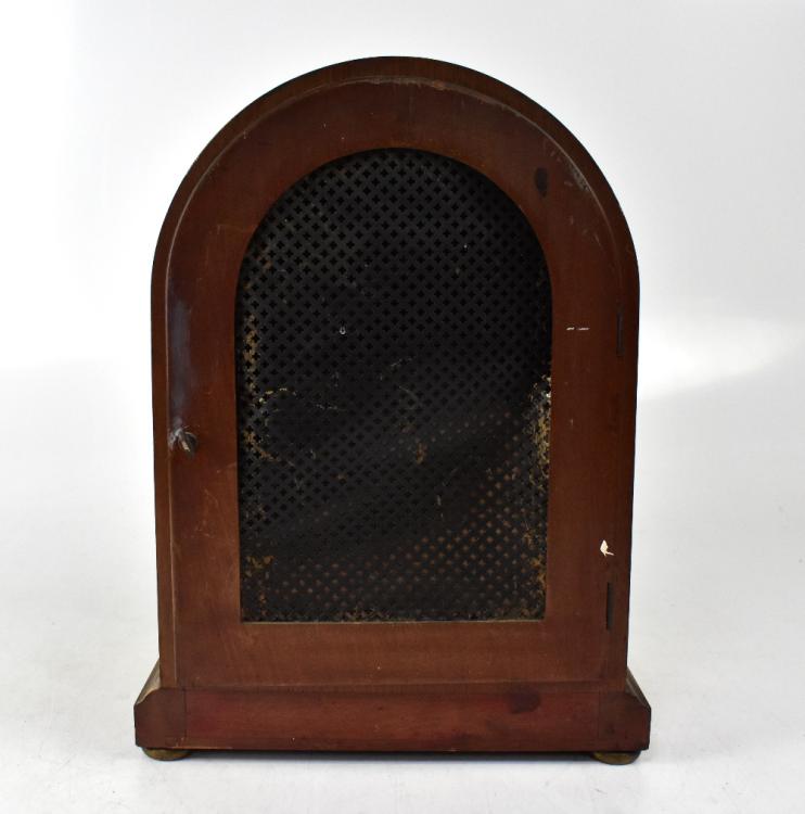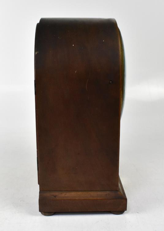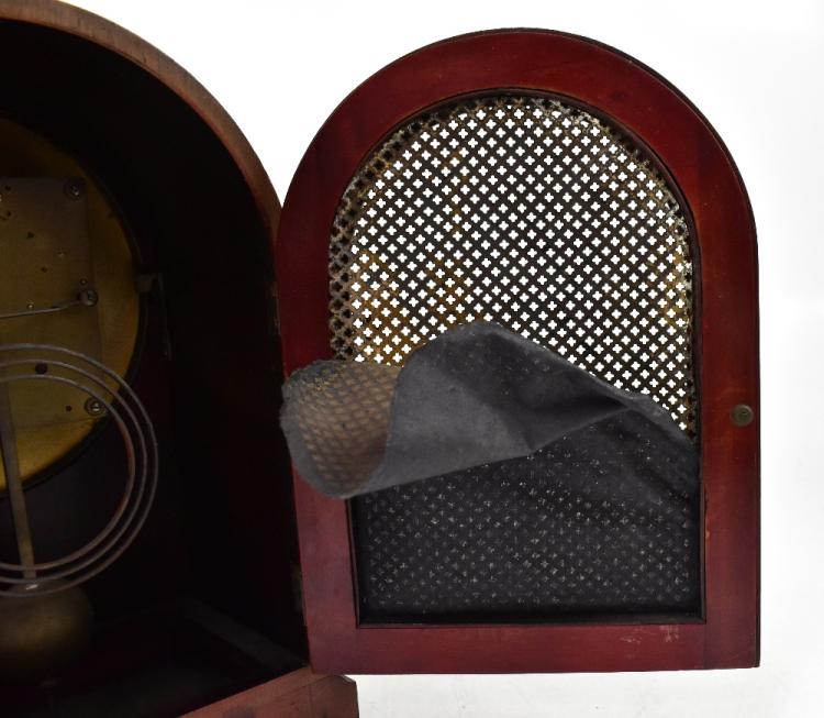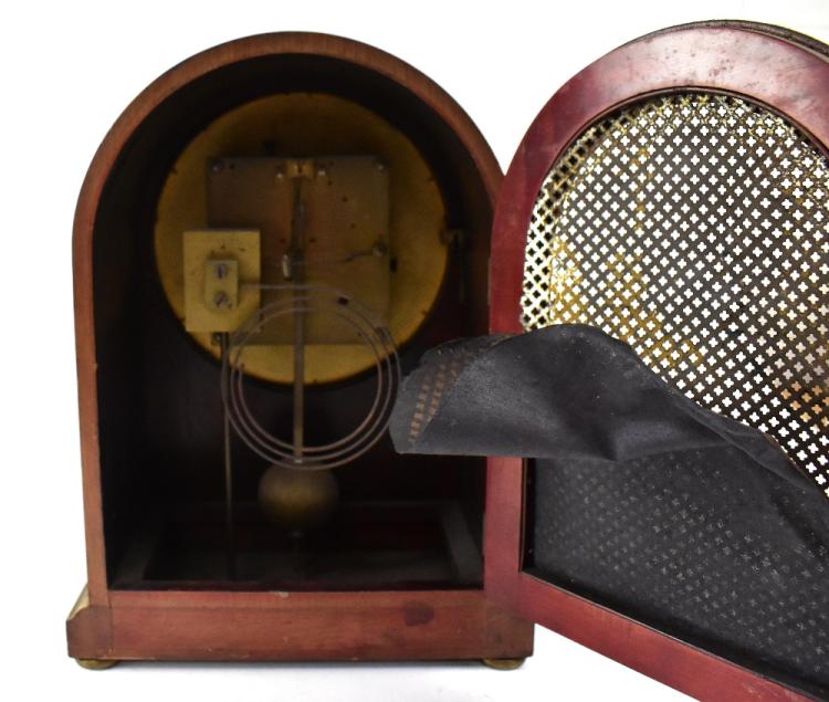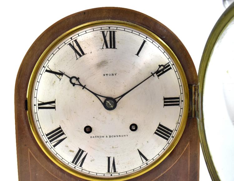 Lot 68 of 1102: A George V mahogany arched-top mantel clock with boxwood stringing, the silvered dial set with Roman numerals and inscribed 'Barrow & Dewsbury Storey', with an eight day movement striking on a coil, the case with a hallmarked silver engraved plaque 'Presented to Mr W. S. Sadler on the occasion of his marriage, Sept. 26th 1914 by the commercial staff of Messrs. Vickers Ld Barrow-in-Furness', the case raised on bun feet, height 36cm.