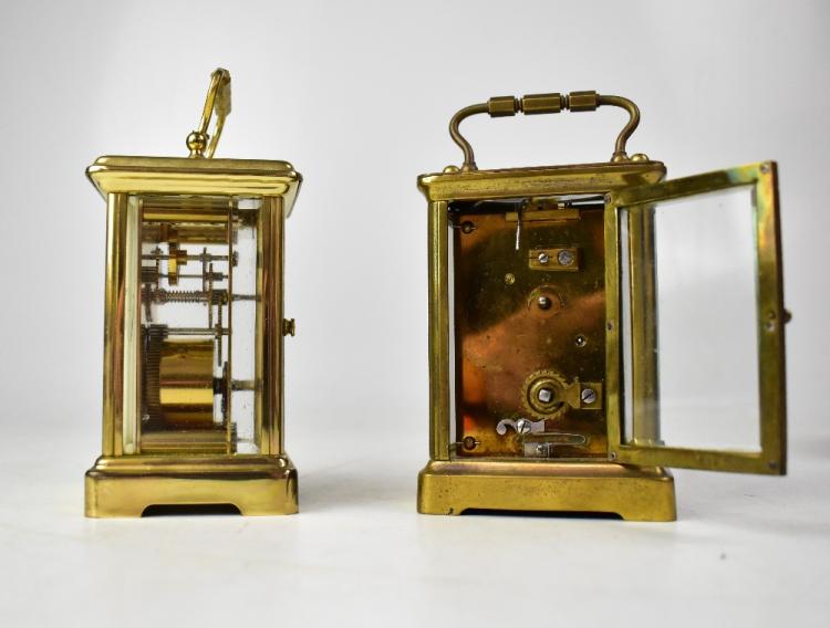 Lot 70 of 1102: BOODLE & DUNTHORNE; a brass cased carriage clock, retailed by Bornand Frères Montbeliard, the enamelled dial set with Roman and Arabic numerals, with swing handle, height including handle 15cm, together with one other plain cased brass carriage clock, the enamelled dial set with Roman numerals, with swing handle (2).