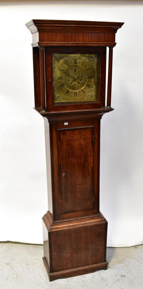 Lot 72 of 1102: WILLS; a George III oak cased longcase clock, the moulded cornice above brass 12'' dial set with Arabic and Roman numerals, centred with subsidiary seconds hand and rolling date aperture, inscribed 'Wills. Truro 1790', crossbanded door to stepped plinth on bracket feet, height 184cm.