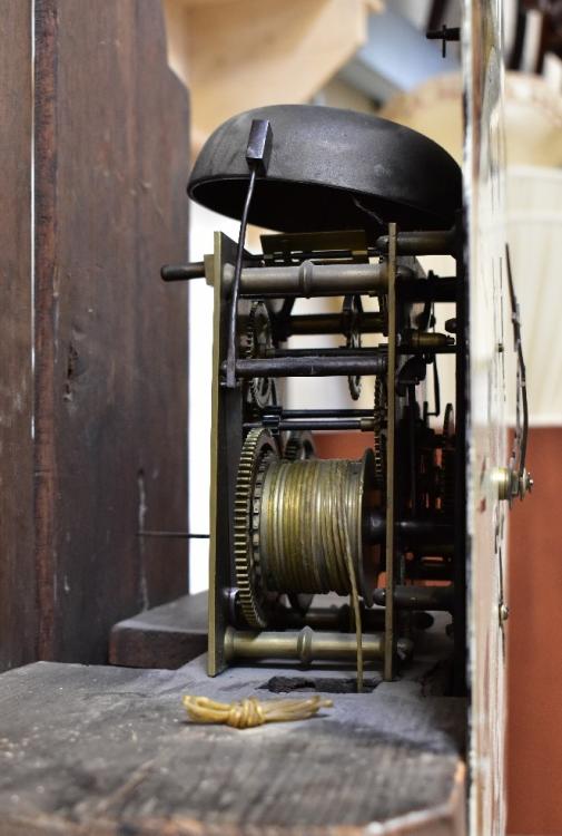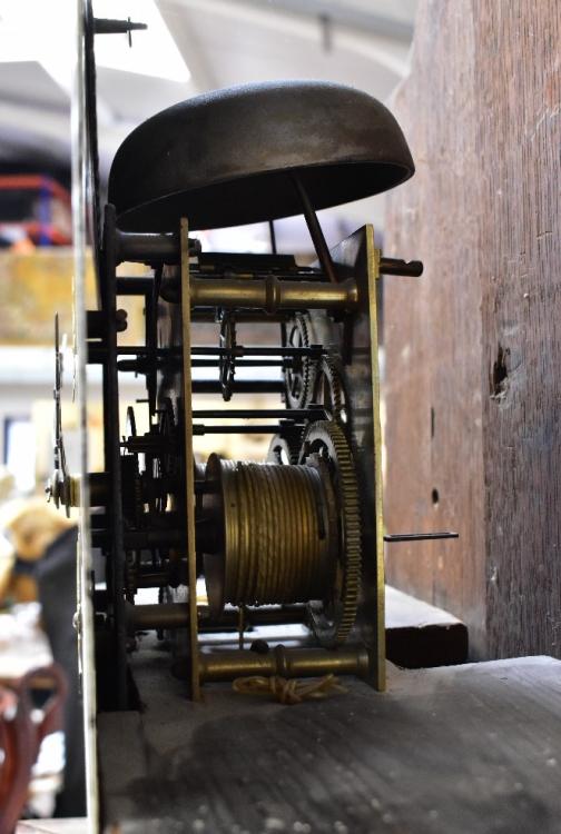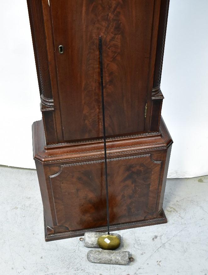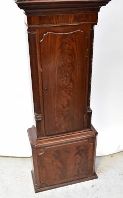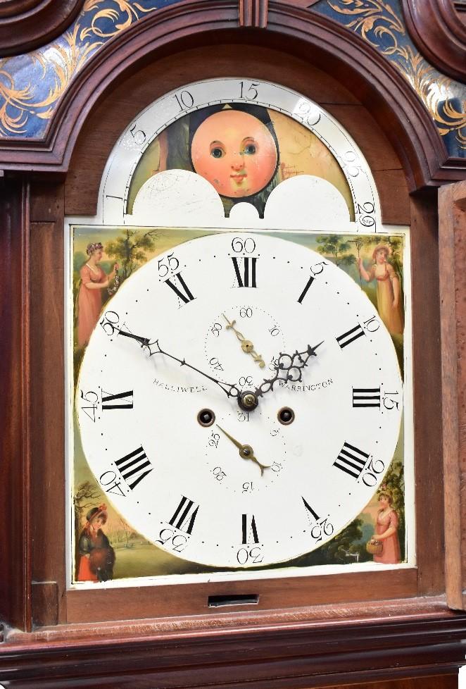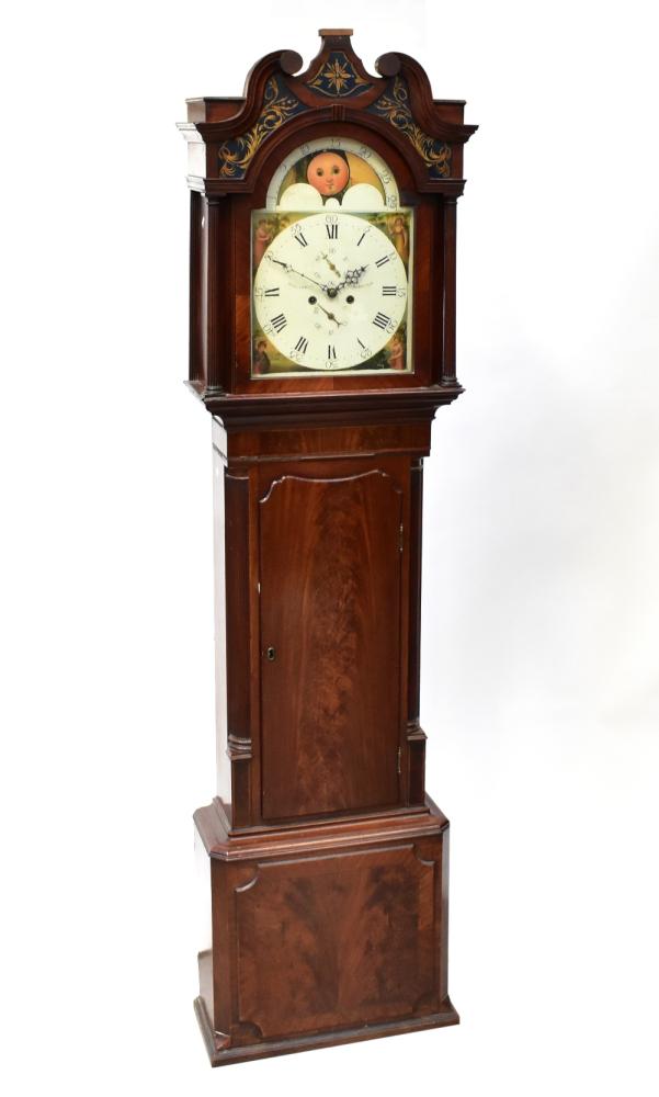Lot 72A of 1102: HALLIWELL, WARRINGTON; a George III mahogany cased eight day long case clock, the broken swan neck pediment above arched painted dial, with rolling moon phase, the chapter ring set with Roman and Arabic numerals, with subsidiary seconds and day dial, above a shaped door flanked by quarter reeded pilasters, above a stepped plinth base, height 223cm.