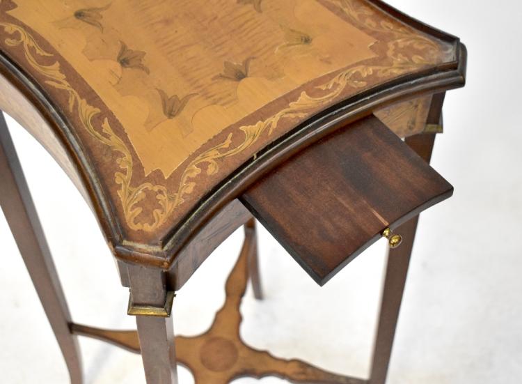 Lot 9 of 1181: A late 19th/early 20th century marquetry inlaid mahogany stand with square and concave side top and raised gallery, small pull-out candle slide, on four tapered sabre supports inset with floral drops united with cross stretcher, height 78cm, width at widest point 33cm. Provenance: From the descendants of Andrew Barclay Walker (of Walker Gallery Liverpool), this item has been passed down the generations and is suggested from the family that this is originally from the Andrew Barclay Walker estat