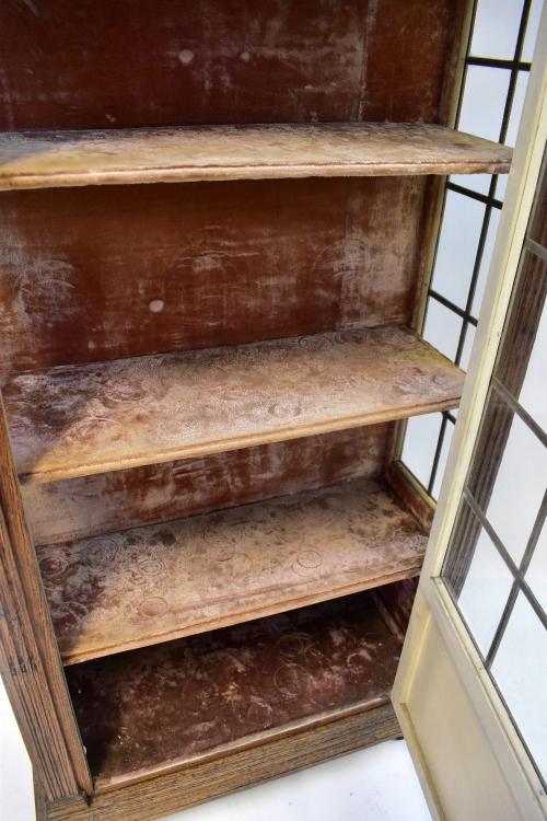 Lot 18 of 1181: An early 20th century Continental oak display cabinet, the caddy top above ribbon applied frieze, with glazed upper section to the door and panelled detail beneath, raised on turned feet, height 185cm.