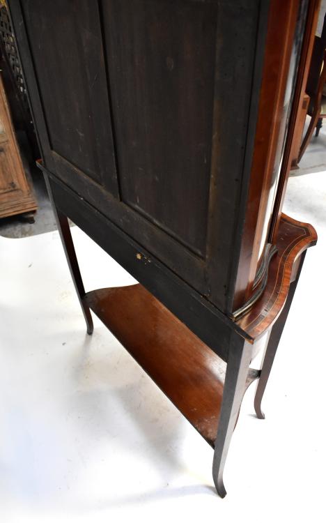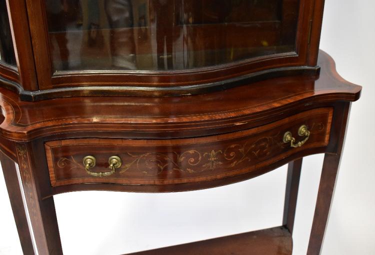 Lot 24 of 1181: An Edwardian mahogany and inlaid display cabinet on stand of serpentine outline, with glazed shaped doors above base with single frieze drawer, raised on square section, slightly outswept legs united by a stretcher, 173 x 92 x 50cm.