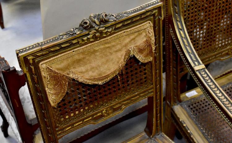 Lot 28 of 1181: An early 20th century Continental gilt wood and bergère caned salon suite comprising a canapé, pair of elbow chairs and pair of side chairs (5).