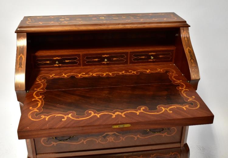 Lot 36 of 1181: A reproduction Italian marquetry inlaid bureau with hinged fall front above two long drawers, lower cushion moulded drawer, raised on cabriole legs to gilt metal sabots, width 92cm.