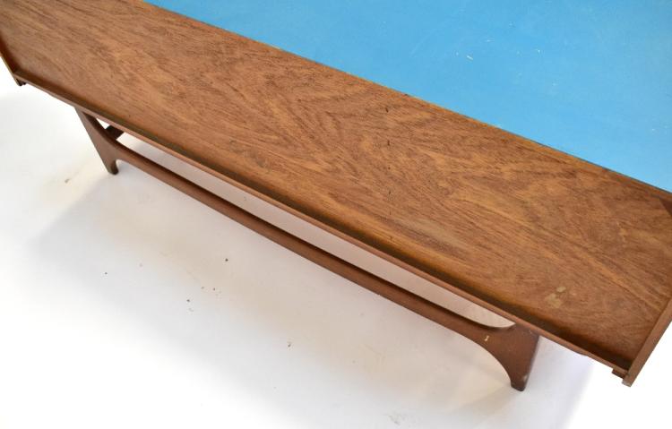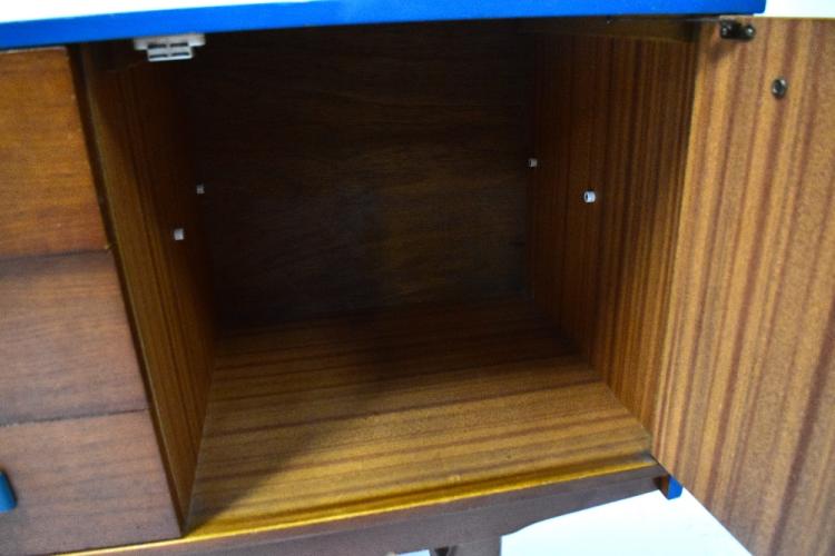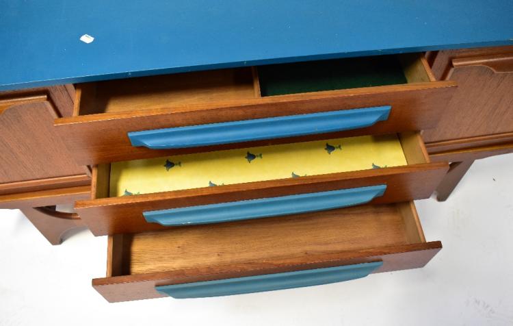 Lot 39 of 1181: STONEHILL FURNITURE LTD; a 1960s teak 'Stateroom' sideboard, with three central drawers flanked by a pair of panelled doors and raised on stylised stretchered supports, with teal painted top, sides and drawer handles, 73 x 161 x 43cm.