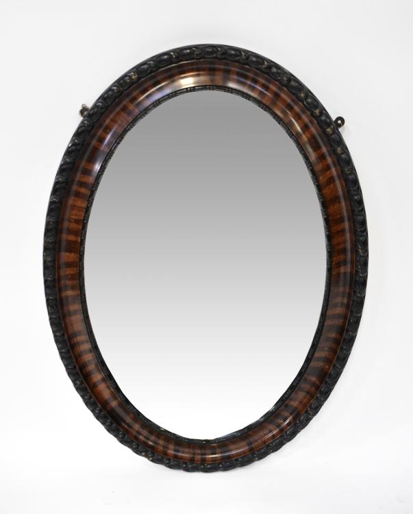 Lot 78 of 1181: Three mirrors comprising a large oval mirror with mahogany and ebonised frame, with bevelled plate, 88 x 61cm, a cream and gilt-heightened framed oval wall mirror and a smaller pierced example with bevelled plate (3).