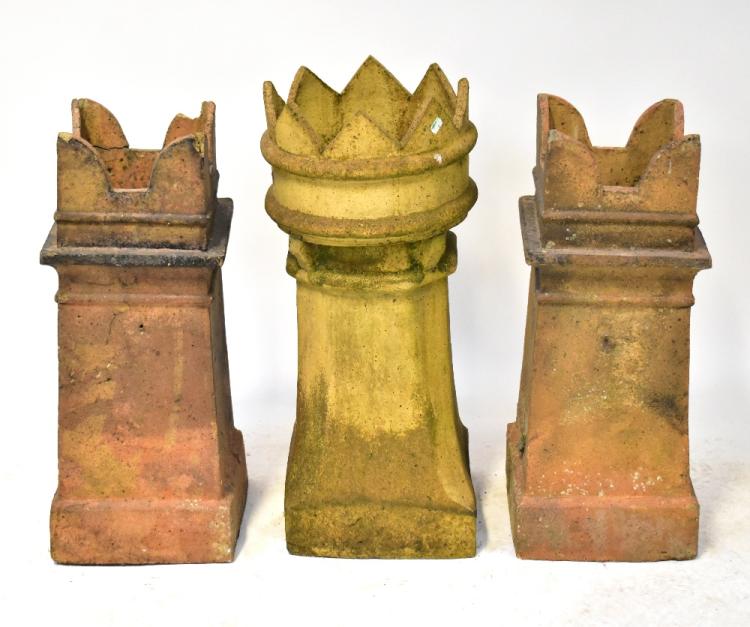 Lot 81 of 1181: A pair of square section chimney stacks and a further square section example with circular upper collar, height of tallest 80cm (af) (3).