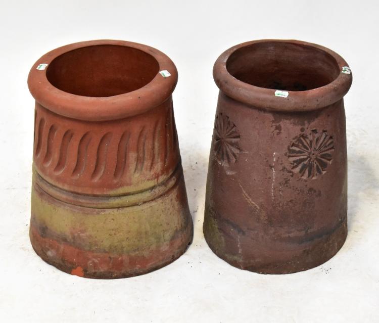 Lot 82 of 1181: Two similar terracotta chimney tops, one with floral decoration, the other with ribbed decoration, heights 42cm (2).