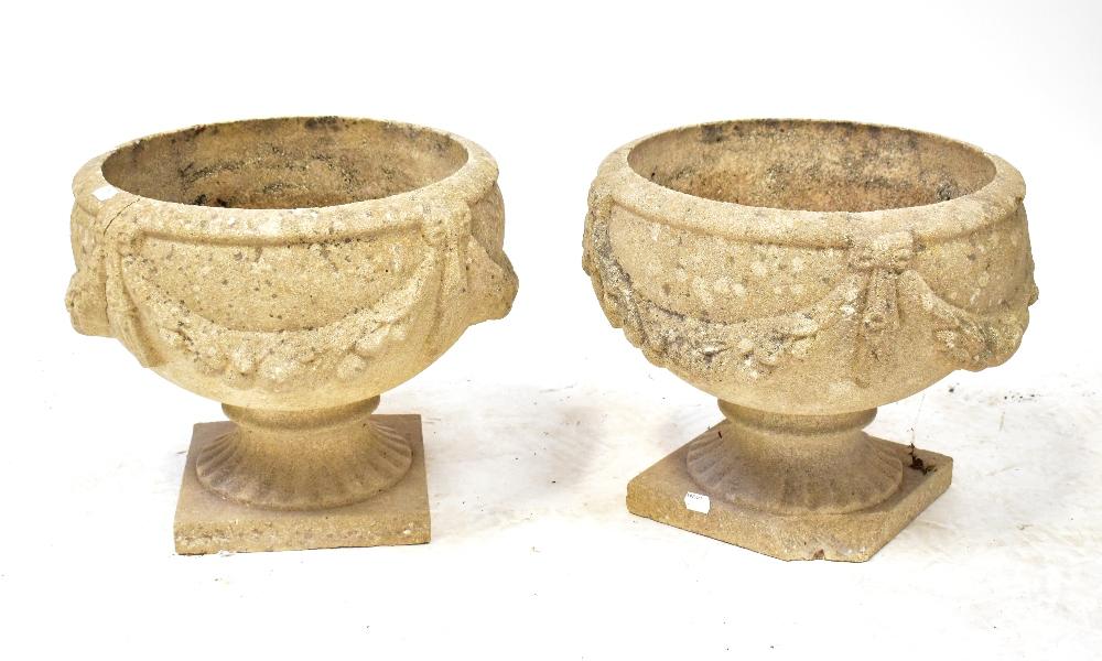 Lot 84 of 1181: A pair of composite garden urns with swag decoration, raised on a square section base, height 34cm, diameter 40cm (af) (2).