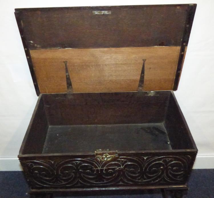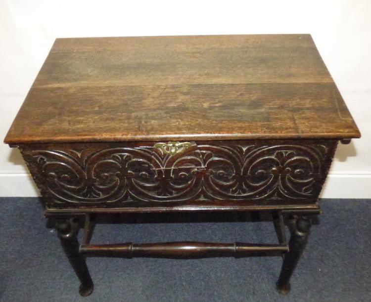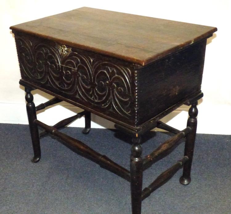Lot 33 of 1231: A 17th century oak chest with lift-up lid and Gothic carved front panel, on stand with turned supports, to pad feet, 70 x 74 x 43cm.