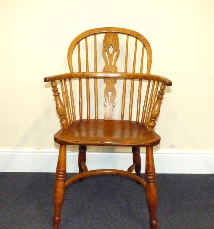 Lot 39 of 1231: A 19th century low Windsor chair with comb back, pierced back splats, turned armrest supports, possibly elm seat and curved stretcher, height to top of seat 43cm, height of back 90cm.
