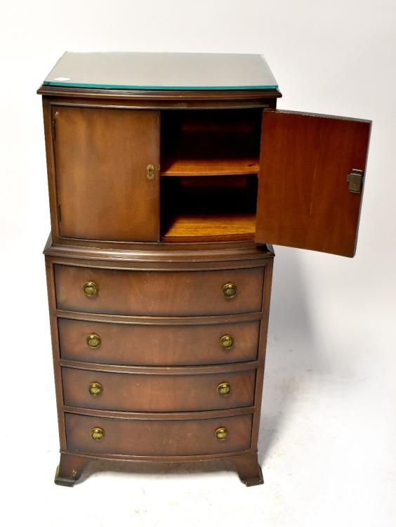 Lot 49 of 1231: A Georgian-style mahogany leather-topped drum table, an Edwardian-style nest of tables, a reproduction small sofa table and a small mahogany cupboard on chest of four drawers, height 110cm (4).