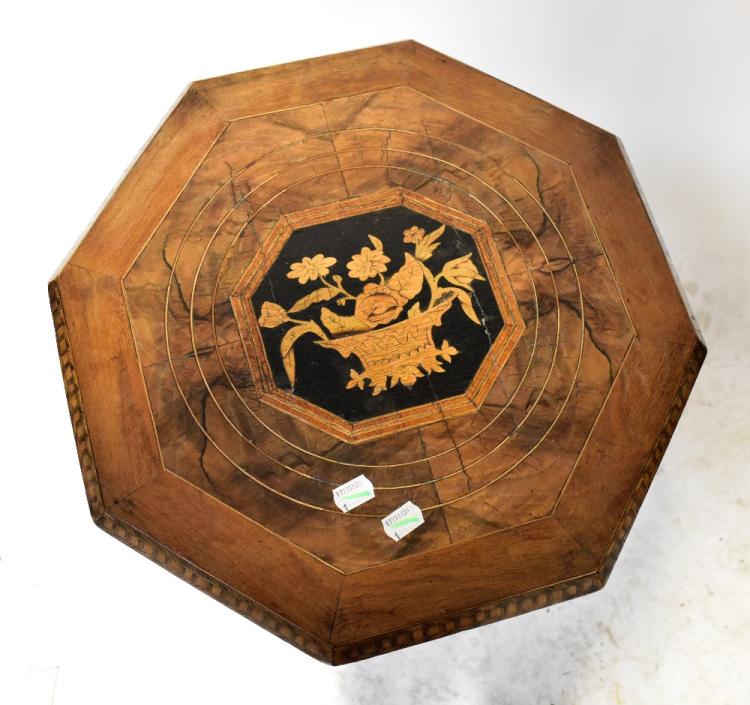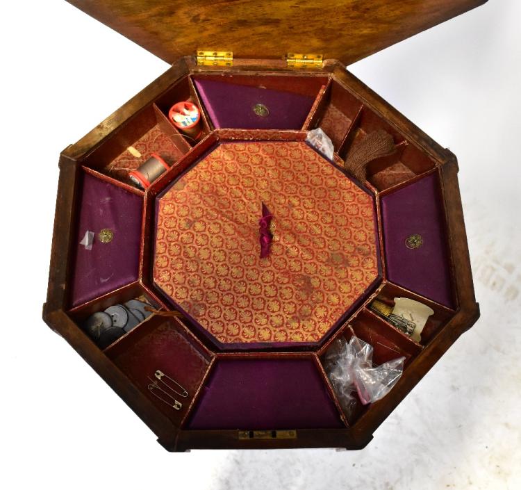 Lot 65 of 1231: A Victorian walnut octagonal top sewing table with fitted interior and tapering trumpet-form column, on tripod base, height 75cm.