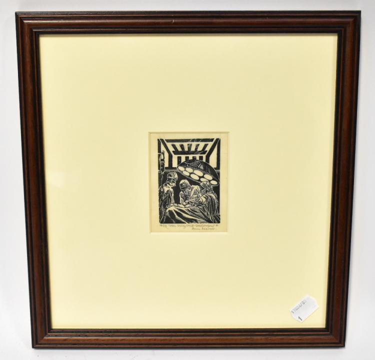 Lot 6 of 104: ANNE DESMET; limited edition of fifteen, wood engraving on Japanese paper, 'Irene Irving (1928-2020) Surgeon', 30 x 30cm, framed.