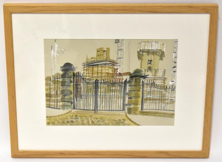 Lot 12 of 104: JULIA MIDGLEY; watercolour and pencil, 'Albert Dock Gates', 50 x 59cm.