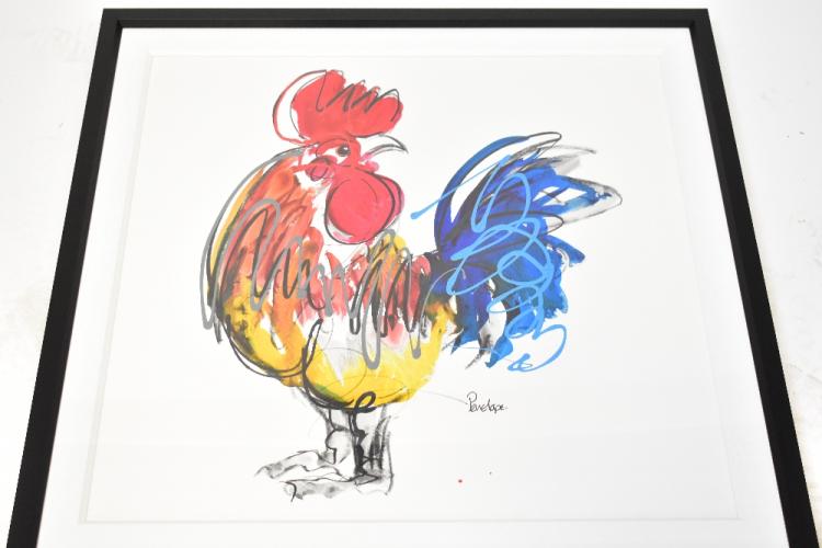 Lot 35 of 104: PENELOPE TIMMIS; mixed media, 'The Happy Cockerel', 98 x 95.5cm,